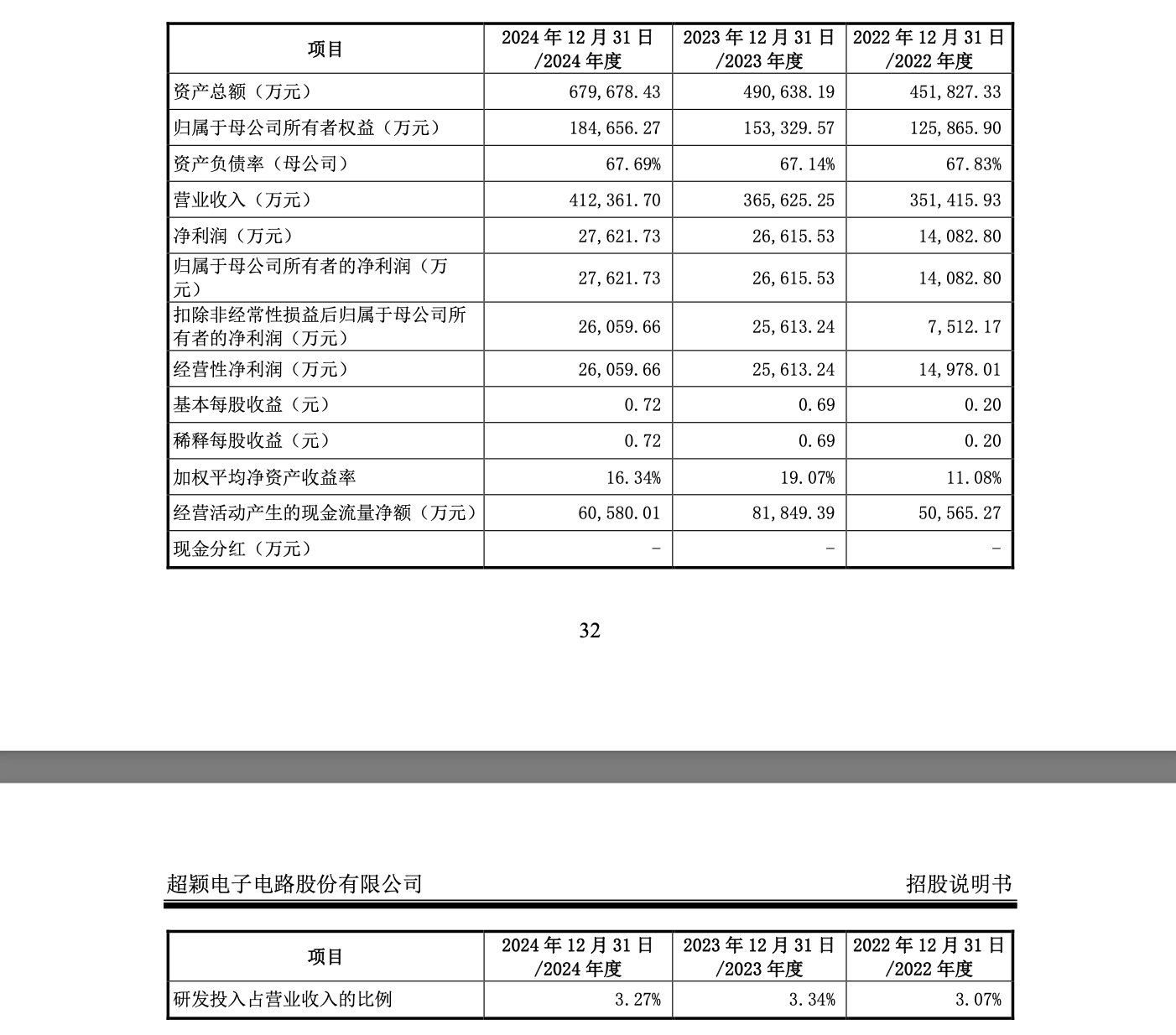2022-2024年及今年上半年,超颖电子的营业收入分别约35.14亿、36.56亿、41.24亿、21.85亿元;净利润和归母净利润分别约1.41亿、2.66亿、2.76亿、1.59亿元;扣非归母净利润分别约7512.17万、2.56亿、2.61亿、1.42亿元。